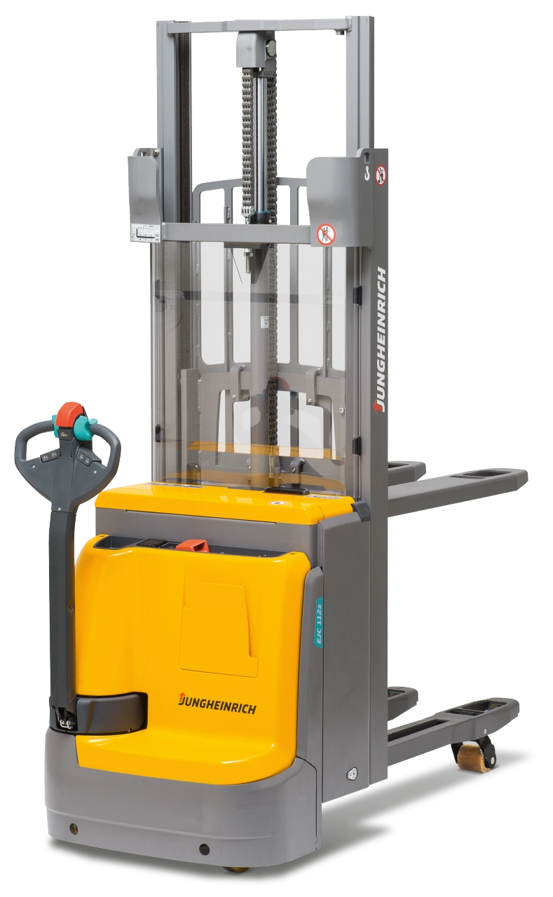 Os ágeis e flexíveis stackers EJC 112z são particularmente versáteis. Com a sua elevação adicional do braço de apoio, estes veículos têm uma altura acima do solo mais elevada, que também permite superar grandes irregularidades no piso, lombas e rampas, de forma rápida e fácil. Opcionalmente, a elevação do braço de apoio também pode ser usada para o transporte em dois níveis de duas paletes. A elevação do braço de apoio e do mastro funcionam de forma independente. E mesmo em espaços apertados, o EJC 112z permanece ágil devido ao seu design compacto. O sistema hidráulico proporcional garante que até cargas pesadas sejam empilhadas e removidas de forma suave e precisa. Isso protege a carga, o stacker e a sua infraestrutura de armazém. A potente tecnologia de corrente trifásica é alimentada por baterias de longa duração que podem ser carregadas rápida e facilmente com o carregador integrado.