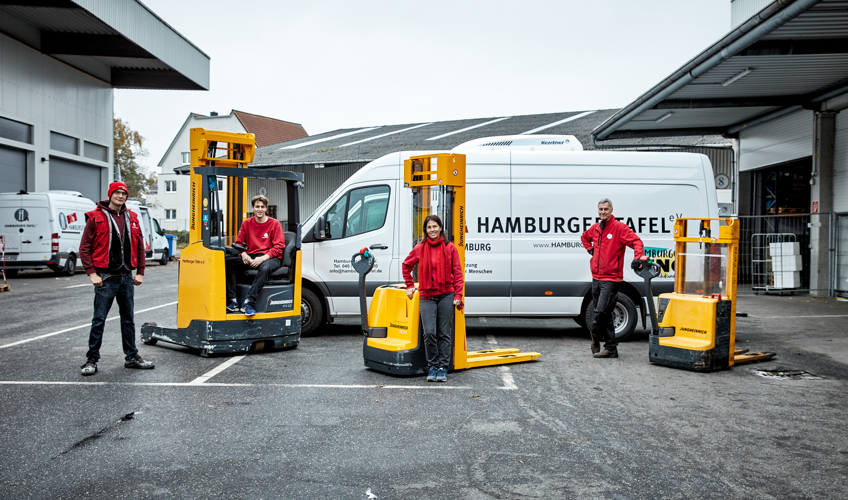 O Hamburger Tafel apoia pessoas necessitadas com alimentos que não se destinam mais à venda. A associação arrecada esses alimentos e abastece instituições sociais que operam pontos de distribuição de alimentos. Desta forma, 30.000 pessoas necessitadas recebem alimentos todas as semanas. O Hamburger Tafel detém um armazém, com instalações de refrigeração e congelação, onde é utilizada o porta-paletes doado pela Jungheinrich.